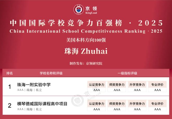 在京领2025中国国际学校竞争力百强榜·美国本科方向中,珠海一附实验中学和横琴德威国际课程高中项目上榜,均获得3A综合评级。
