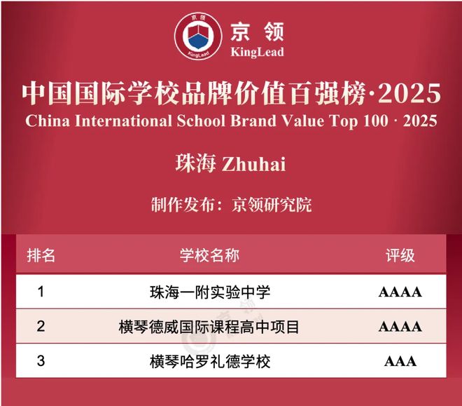 珠海市共有3所国际学校荣登京领2025中国国际学校品牌价值百强榜。其中2所学校荣获4A评级,为珠海一附实验中学、横琴德威国际课程高中项目。1所学校荣获3A评级,为横琴哈罗礼德学校。