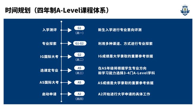A-Level课程采用三年或四年学制,分为IGCSE(国际普通中学教育证书)和A-Level两个阶段。IGCSE阶段学制通常为两年,成绩优异者可压缩至一年完成,期间学生需学习英语、数学及中文三门必修,并从超过70门可选科目中选修五门。进入A-Level阶段后,学生需攻读三至四门学科,课程涵盖进阶数学、物理、化学、生物、经济、会计、计算机等。A-Level考试成绩采用等级制评定(A*–E及U),每年设有三个考季,学生可多次报考,最优成绩可用于申请英国、美国、加拿大、澳大利亚、中国香港等全球多数国家和地区的本科院校。