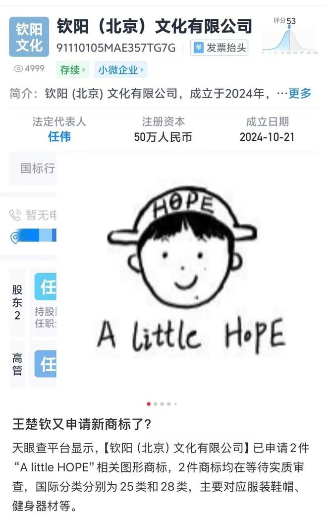 众所皆知,此前王楚钦妈妈的职业、工作等等都非常神秘,不过,在近期,随着一条消息的官宣,王楚钦的妈妈也是亮相了新岗位。王楚钦妈妈亮相了什么新岗位呢?众所皆知,此前陈梦的妈妈注册了王楚钦的英文商标“HOPE WANG”进行商业开发,而为了更好的开发王楚钦的商业价值,更好掌握王楚钦的商业价值开发,王楚钦的妈妈成立“钦阳”文化有限公司,王楚钦的妈妈注册了“a little hope”商标,这个公司的商标是戴着发带的小男孩,从造型和下巴的痣来看,这个小男孩无疑就是王楚钦,而这副作品很可能就是王楚钦自己手绘的。