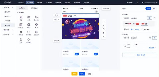 自定义网校首页,打造专属“门面”:首页是学员对网校的第一印象,直接影响用户留存。钉考单招网校允许机构完全自主设计首页布局;(1)机构主打“名师教学”,可将师资展示模块放在首页核心位置;(2)侧重“爆款课程”,则能将热门课程卡片置顶;若想突出“学员成果”,也可嵌入学员高分案例轮播。通过排版、风格模板选择,机构无需专业设计团队,就能打造出既符合品牌调性,又能精准传递核心优势的首页,大幅提升用户好感度。