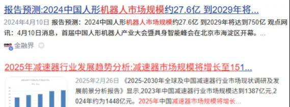 2024年我国人形机器人一场规模已达27.6亿元,而这一数字到了2030年将会暴增至3000亿元,直接翻了100倍,其潜力可谓无穷;而减速器的市场规模将会在2025年直接突破1500亿元。